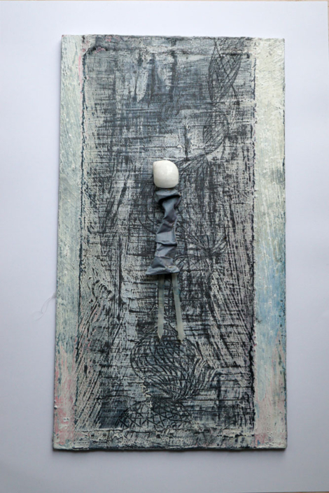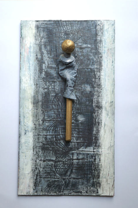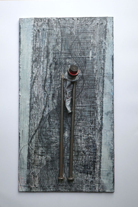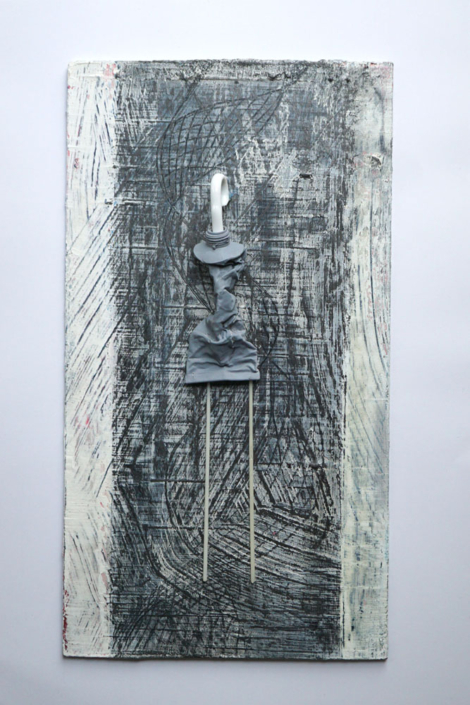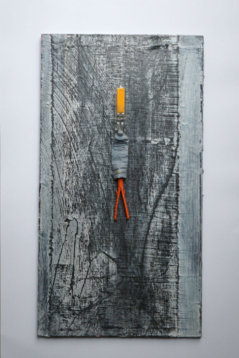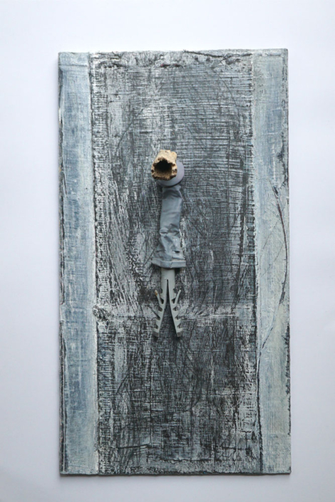 Objekte für die Wand, ca. 20 x 34,5 cm, Sperrholz, Gewebe, Farbe, Grafit, alte Farbtuben, Fundstücke, 2025/26